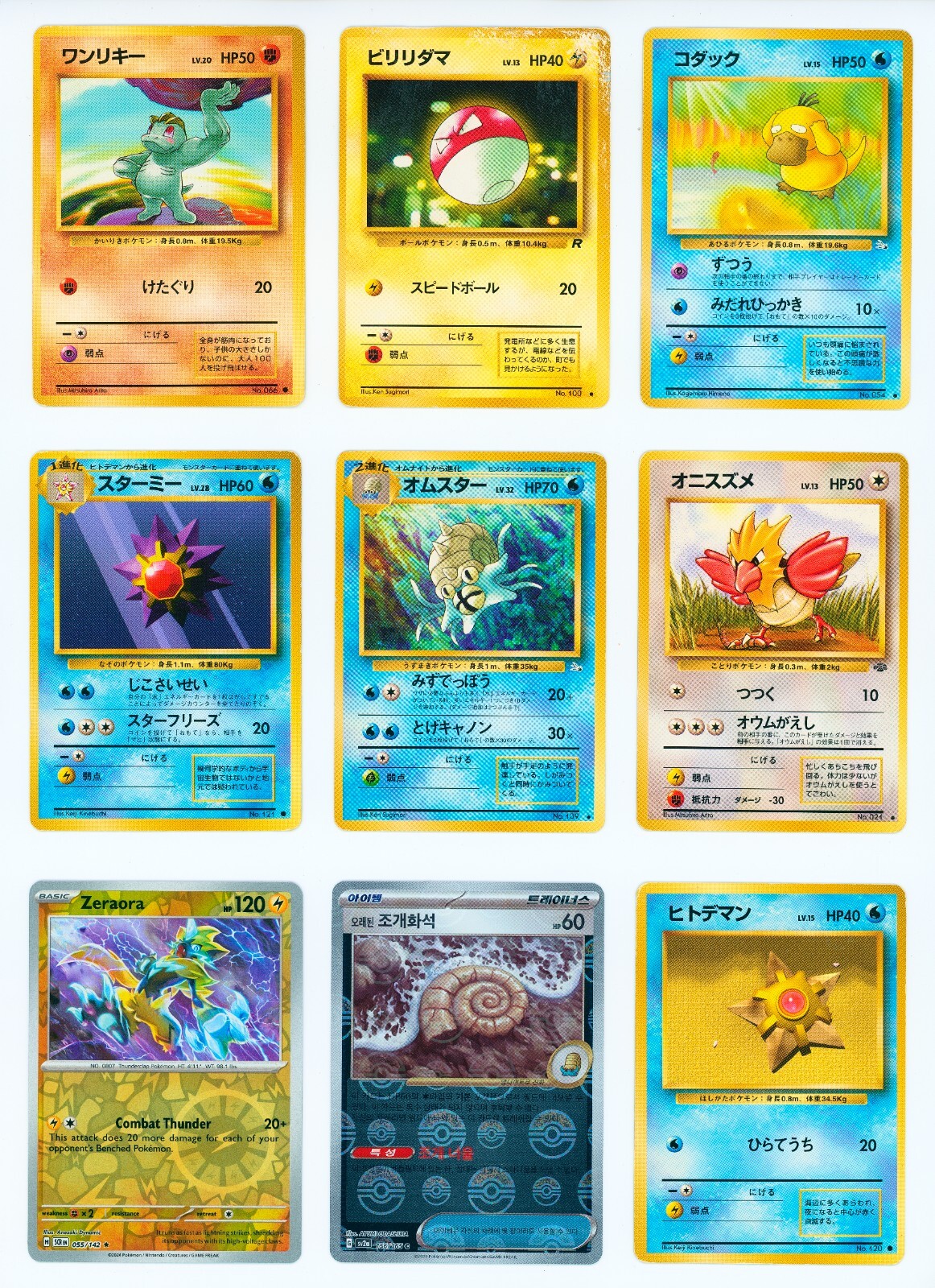 This Lot includes the 9 cards pictured. (Machop, Voltorb, Psyduck, Starme, Omastar, Spearow, Zeraora, Omanyte, Staryu).Please check out some of my store and other cards, I have a massive collection and am just starting to sell some of the cards.